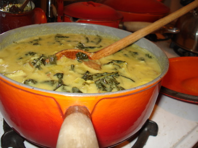 Boh and I went for a hike in the rain this weekend — we were the only ones out wandering, and it was absolutely beautiful in that foggy, forlorn, expansive kind of way. The weather was the kind that makes you want to eat soup, and, inspired by this post by Amy at angry chicken, I modified a Moosewood recipe for curried spinach and pea soup to be a warm, soothing mixture featuring kale, potatoes and Thai chile paste.