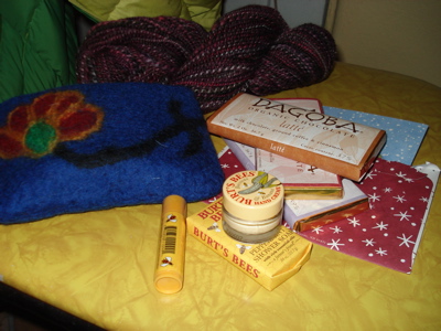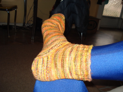 See? Now you can enjoy my completed sock without being completely distracted by the glow of my electric blue spandex. Maybe I kept them on for the whole morning. I am really proud of this sock — the first of my second pair ever. There are still a few teeny mistakes here and there, but overall, the heel is solid, the stitches are tight and even, and I even kitchenered the toe! I was so excited about all of this that I immediately cast on for the second sock. I asked Mr. Claus for some long sock circs and a Magic Loop book, and I want to finish these before I hear those reindeer hoofs on my parents’ roof. (This is going to be a long post — I’ve only been blogging a short while, but I missed you this week.)