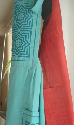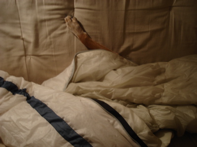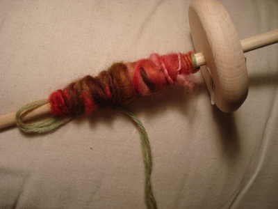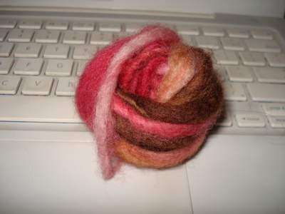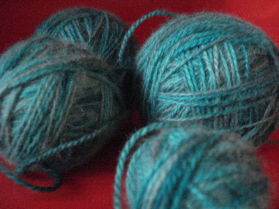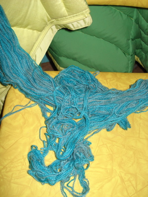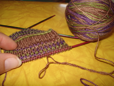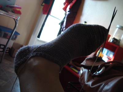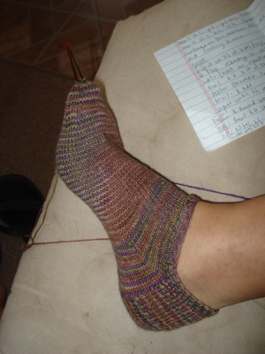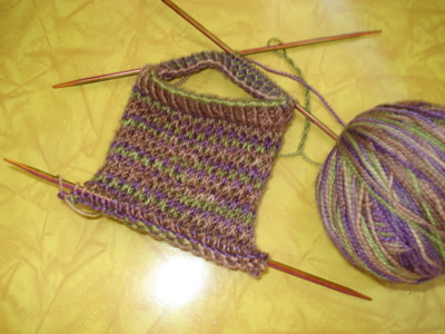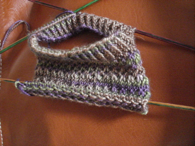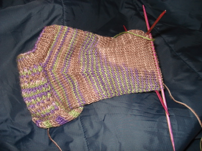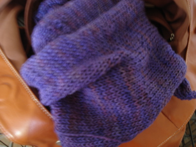 It was all I could do to keep myself from casting on another pair of socks at 11 PM last night, just to admire these on a sock in progress. I am plugging away at Sunday Market Shawl number 2 — brought the remains of the one the dog gnawed through to show and tell last night, and am slowly adding length to its replacement. Here’s a rather blurry picture that shows the gorgeousness of the purples in this Dream in Color Smooshy yarn: