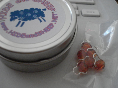 Morning, folks. I think I posted about this when it actually happened, but as last night was likely my last regular attendance at weekly knitting night, allow me to tell you a brief sock story. Back in the fall, my internet was down for at least a week. My ISP couldn’t figure out what was wrong, and I was frantically working on all of my graduate school applications, so I was spending an hour or so every night at the coffee shop closest to my house. One Tuesday evening, when I stopped in to submit some forms and check email, I noticed a table of women who looked incredibly fun doing something with their hands — I had to look again to confirm that they were actually knitting! I introduced myself and asked if I could join them. Luckily for me, I had one of those fleece artist yellow tiger socks in my bag. They welcomed me and encouraged me, and soon I was knitting with them every Tuesday night. I’m heading to Base Camp next week, and then off to New Home for graduate school, and while I am going to try to meet up with them whenever I come into town on a Tuesday, yesterday was the first of all of my goodbyes. They marked (ha) my departure with an incredibly sweet and unexpected gift: gorgeous sock-sized stitch markers from Hide and Sheep (on etsy).