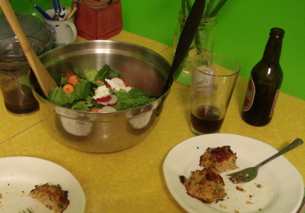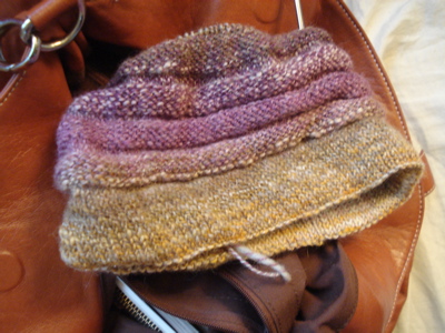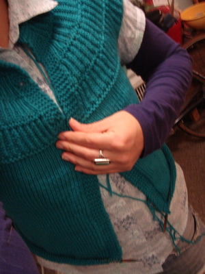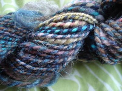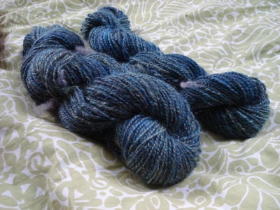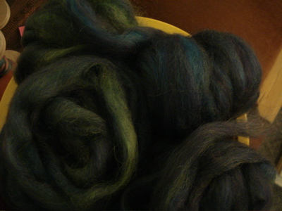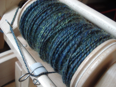 Also, late last night I decided to put something else on the wheel. (During break, I was spinning every day, and this week I haven’t been able to find the time. So I made some.) This is 6 oz. of 50% merino/50% other wool in a gorgeous range of deep greens and blues from Friends’ Folly Farm in Maine. My dear friend H. (her last name initial, since that’s what I call her) picked this up for me at a sustainability fair of some sort this fall and surprised me with it. I was itching to spin a 2-ply, and decided that this might be just the thing. This stuff drafts like a dream, and part of the way through putting the first 3 oz. on the bobbin, I switched to spinning this in more of a long-draw type method, and my singles became even more even. Here’s a less than awesome shot of the bobbin. I blame the lateness and the harsh overhead light.