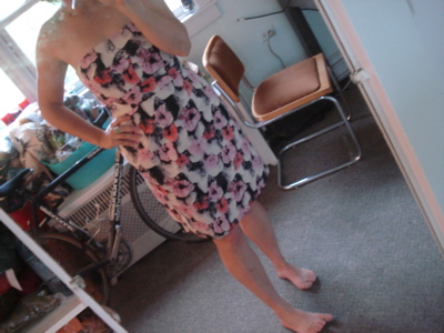 (Forgive the awkward bad mirror picture.) She’s asked me to do a reading at the wedding, which is in a church, which means I need something to cover my shoulders. And here’s where the brainstorming comes in. Clearly, it would be awesome if I could knit myself something to go with this dress. What should I make? A shawl? A shrug? In what color? I’d love to hear what you think.