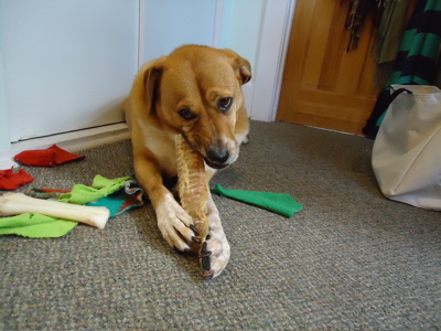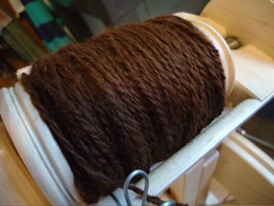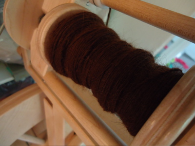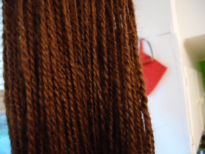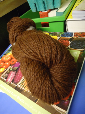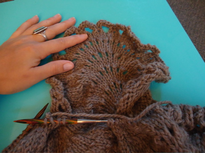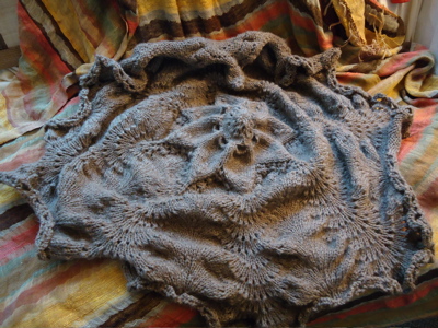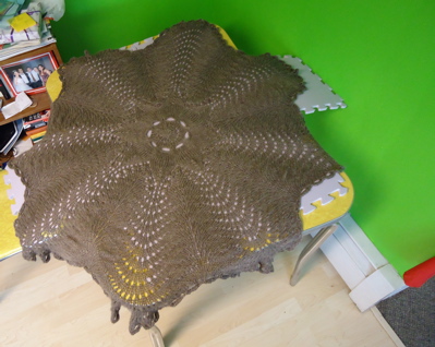 First, the answer to the blocking dilemma: blocking trumps civilized meals at the table. I opted not to use pins — the ecowool was sticky enough that it seemed to stay where I pulled/tugged it, probably thanks to gravity, as most of the “petals” were hanging off the table. Despite rolling the blanket in a towel before laying it out to dry, I had to periodically wipe up puddles from beneath the petals. Because this is a wedding gift, I decided not to spread it out again to photograph it — that just seemed like a recipe for a blanket covered in Boh-hair. So here’s a shot of the finished hemlock ring, folded and draped over a chair in the kitchen: