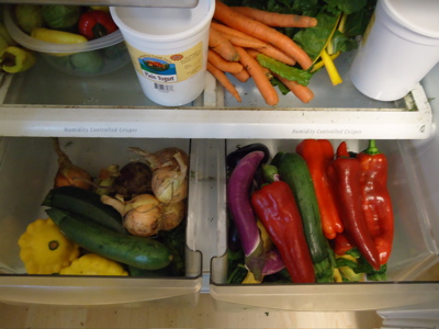 Also, my fridge was so colorful after I unloaded yesterday’s haul from the farm that I just had to take a picture. I also opened the fridge door and pulled out the drawers so that the boy could admire everything from the rainbow of goodness inside to the adorableness of the baby eggplants.