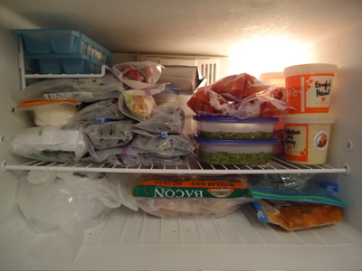 I also made Kaela’s Chile Verde Base — this stuff is delicious, and so simple: tomatillos, garlic, hot peppers, and cilantro. Basically, you partially roast the first two, and throw all the ingredients in a food processor. I’m going to make another batch of this later. Storing this in the freezer to use as a base for soups and sauces prompted me to clean out the freezer. (Stock from 2008? Green chiles from the Southwest that I did too good of a job hoarding? I’m looking at you.) Now there’s room for lots more chile verde base! Oh, and berries. I might have frozen what we picked on Saturday as incentive to do a good job picking yesterday…
