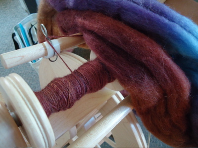 I put something new on the wheel yesterday. I have another bump of alpaca to spin for my friend, but I thought it might be nice to switch up fibers first — sort of a wheel palate cleanser, if you will. This is SCF bfl top in the Reflection colorway — the July 2010 club fiber, and the colors are so vibrant — very autumnal, with bursts of blue and purple. This will be a gift, and I am already excited about it — the colors strike me as just right for the knitter I have in mind.