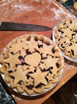 On Saturday night, I made a tomato tart with goat cheese and about a quart of farm cherry tomatoes. (This is the one with the dijon mustard slathered on the inside of the crust.) That salad is all farm veggies, too: red peppers, grated beets, carrots, cherry tomatoes, and lettuce. D. brought a growler of a delicious amber brew from his home.