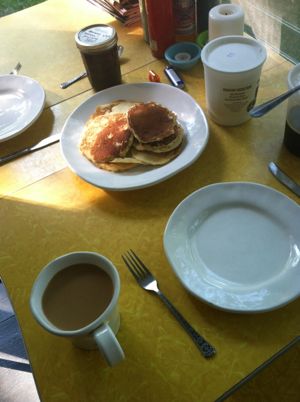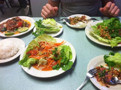 D. arrived on Friday, after a long bus ride. I took him straight to a Lao feast, complete (though you can’t see it here) with Beer Lao I picked up from our local beverage store. Tam mak heung, nem khiaow, khao niaow, and a red curry fish dish with a Lao name I can’t remember. Saep lai.