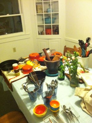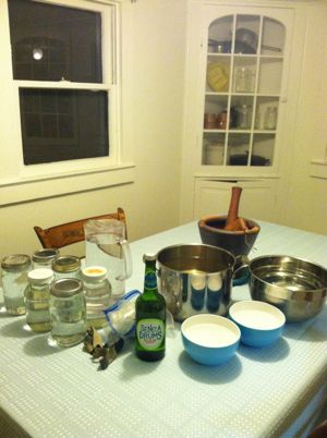I also gathered a decent amount of water, tea lights (to float in those blue bowls of water), my extra headlamp, and (ahem) the gin.