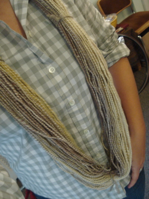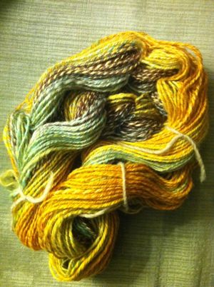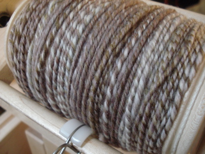 I navajo plied one of the leftover bobbins, and here’s how it looks, unwashed. The trick really is to just slow down. I did this while listening to NPR’s coverage (downloadable!) of Billy Bragg at the Newport Folk Festival, and I found myself treadling very slowly along with his guitar. There’s something really quite graceful about navajo plying, and I’m excited to keep practicing.