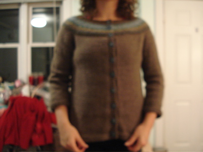 Garter Yoke Cardigan, size 38, with a handspun yoke (out of 144 yards of Hello Yarn romney in Alpine) and a Cascade 220 body (814 yards).