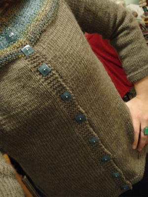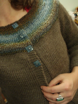 At long last, I sewed the buttons onto my garter yoke cardigan. I tried it on after the first four, just to make sure I liked the look of these buttons (which may or may not have cost me more than the Cascade 220 part of the sweater). I decided to do this late last night, so the pictures are less than awesome, thanks to the overhead lights in my apartment, but I think you’ll still get the idea.