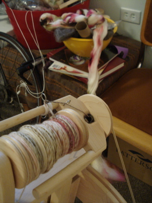 And this stuff — well, it just called to me yesterday. This is the first bobbin of Pigeonroof Studios Merino in the Chard colorway.