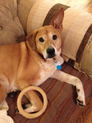 Boh, with his new favorite toy, a plush bone he got from our new vet. Happy Friday, friends.