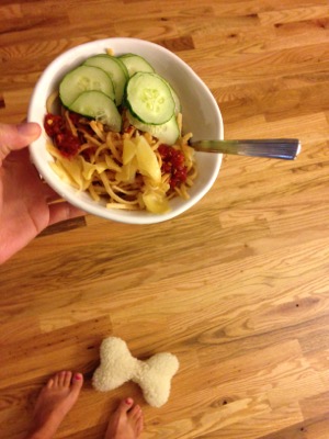 Had my first bowl of yogurt and granola–with peaches!–in the new house. Happy colors, happy dog, happy rooster.