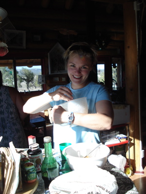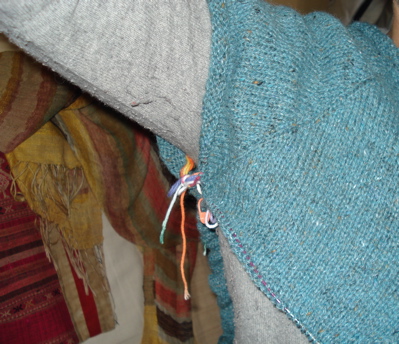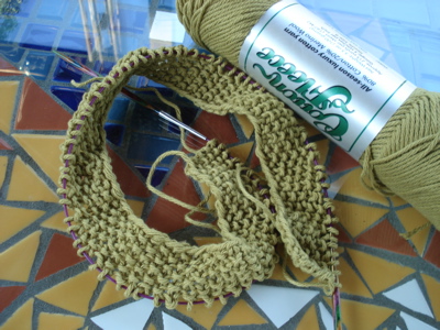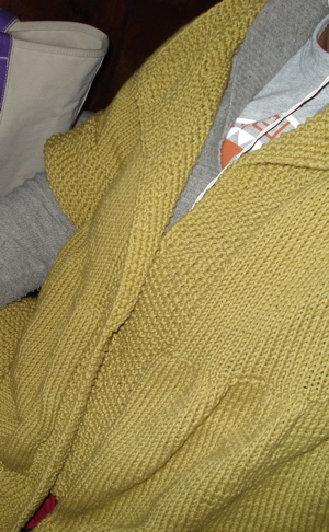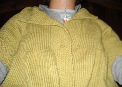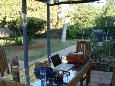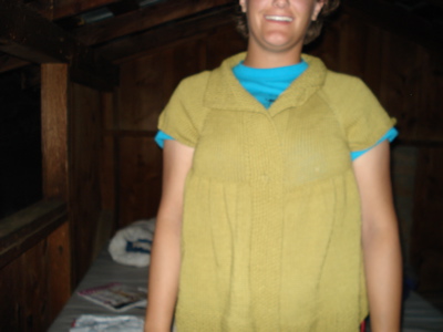 Check out my sweet button! One of our interns at Base Camp surprised me with this after one of our weekly food-buying trips. The colors are a bit weird in this shot (in town, enjoying a bed, a ceiling fan and a leisurely morning, and the shades are still drawn) but let me assure you that the mustardy green of the sweater makes the blue button really stand out. Perfect. I am really proud of this sweater, but it may take a bit of wearing for me to feel like it is “me” enough to get someone to take some modeled pictures for me to post. (Also, it doesn’t *quite* fit with my Base Camp wardrobe…)