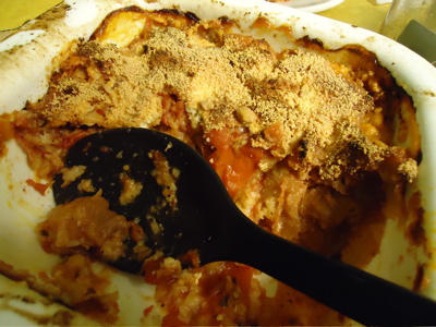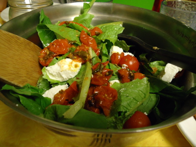 Dear friends came for dinner last night. (Boh was on cloud 9.) Y’all know I love to play in the kitchen, but I especially like cooking both for and with D and T — we have similar tastes (well, aside from D’s brutal hatred for all things eggplant), we belong to the same farm, and we always have a good time together. They brought homebrew, a bottle of homemade limoncello for my freezer(!), beer brewed with Japanese hops for us all to try (it DOES taste like “sunshine in a glass”), and tortilla chips for the mostly-tomatillo-with-a-peach-thrown-in salsa I made. And I decided to test out some new-to-me recipes based on what could be found in my fairly full fridge. After lots of drooling over recipes on my computer screen, I settled on two ideas from Deb over at smitten kitchen: scalloped tomatoes with croutons, and everyday chocolate cake. I paired the tomatoes with a salad of very peppery arugula, cherry tomatoes, goat cheese, and cherry tomato confit with a homemade vinaigrette with a bit more honey than I usually use. I was really happy with how everything turned out — these recipes have earned spots in my kitchen binder!