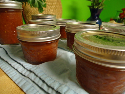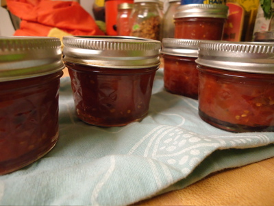 Last night I made tomato jam. And even though incredible aromas filled my entire apartment, I think I need to take my own advice next time and avoid evening canning. See, the recipe calls for allowing the tomato mixture to simmer for 1 to 1.5 hours, in order for it to get all sticky and jammy. And after 1.5 hours, I stirred my mixture and thought to myself, “Well…it isn’t quite thick enough, but it has been an hour and a half, and I am tired, so I’ll go for it.” Then, I packed the jars (mostly tiny jars and a few half pints) with a ladle. I think a slotted spoon might have been a better idea, in order to create a stickier jam. (The strawberry-balsamic jam recipe that I love uses a slotted spoon, and separates the gooey bits from the thinner syrup.)