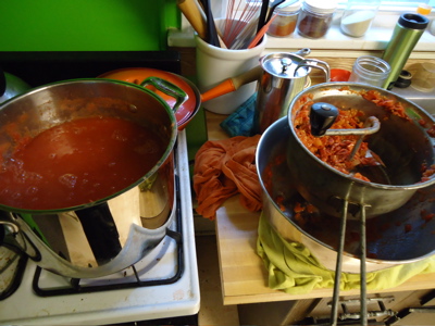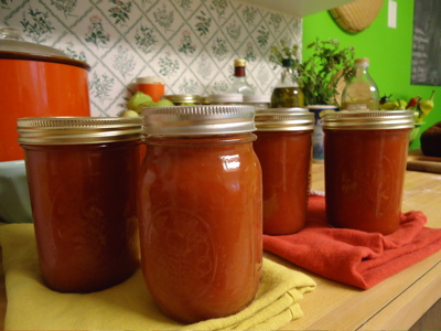 On Sunday morning, I woke up early and set to making a full batch of tomato puree (a la Local Kitchen again). I paused mid-puree to take a picture. (That food mill was actually tucked way in the back of one of my kitchen cabinets when I moved in, despite the fact that my apartment was previously occupied by a solitary male undergrad who made a big mess of the stove and otherwise, to my eye, anyway, did not use the kitchen so much. Whenever I move out of this apartment, I’m taking it with me.) I simmered and simmered the juices from several quarts of paste tomatoes, and ended up with 7 pints of tomato puree.