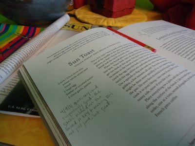 Have we talked about this? I write in my cookbooks: dates, love notes to myself, substitutions, impressions. This does not strike me as odd — I write in all of my books — but I will say this: my cookbook annotations might make me happier than all my other marginalia combined. I like to flip through them and think back to the meal, the evening, heck, even the kitchen in which I last prepared a particular recipe. You can see my notes on Heidi Swanson’s Sun Toast in the picture. Here’s the toast: