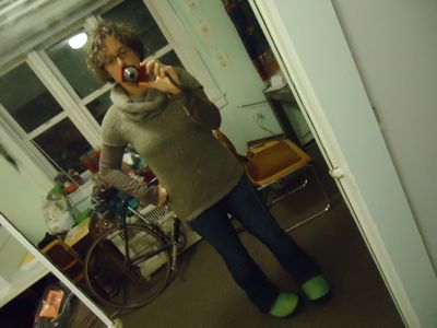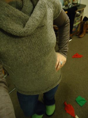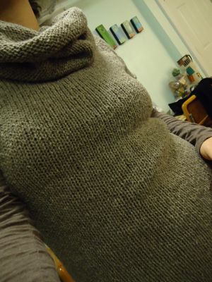 This fits perfectly (over my pajamas). I’m still not sure about the pockets — I have a pretty straight/boyish shape, and I’m not sure I want to add more to the hips. What do you think? I’m going to aim to finish the sleeves so that this is wearable (maybe tomorrow?), and if I can do that, I’ll probably wait to block it and decide about the pockets until I get back from my weekend adventures.