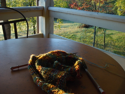[Boh still can’t work the camera; forgive the dirty mirror and awkward self-photography above and below.] Here is the yoke mid-decrease, and here are several photos of the yoke as it exists at this very moment: