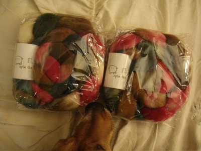 This is a little something I got myself for Christmas — 2 bumps of FLUFF bfl in Turkey Two-Step. I decided that I am not bringing my wheel with me this week, which means it has never left my house, despite the fact that it folds and has a carry bag. I am, however, planning to spend a week at my parents’ house in January, and I think I might bring it then. This fiber will have to wait until next week!