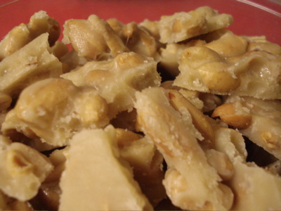 Also, yesterday I made peanut brittle, from Deb’s recipe. (Of course.) I made two batches, and I must not have cooked the first batch on high enough heat, because it did not solidify, and I ended up having to toss it. It stayed chewy, like caramel, which would have been fine, except that it was impossible for me to get the wax paper (even though I greased it) off of this batch. Boo. Glad I made a second batch, though because this brittle is fantastic — crunchy without being too hard to bite into, sweet and salty, yum. I think this is the perfect treat to counter all the Christmas cookies I’ll be baking with my mom tonight!