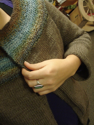 At long last, I sewed the buttons onto my garter yoke cardigan. I tried it on after the first four, just to make sure I liked the look of these buttons (which may or may not have cost me more than the Cascade 220 part of the sweater). I decided to do this late last night, so the pictures are less than awesome, thanks to the overhead lights in my apartment, but I think you’ll still get the idea.