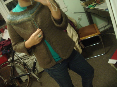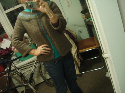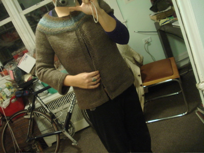 Garter Yoke Cardigan, size 38, with a handspun yoke (out of 144 yards of Hello Yarn romney in Alpine) and a Cascade 220 body (814 yards).