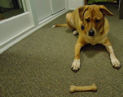 This guy got his own “male” day of sorts yesterday. Instead of working last night, I cleaned out a kitchen cupboard, and found a bone I’d been saving (and then totally forgot about) for Boh. He watched it intently (pictured here), tossed it around a bit, and then ran away from it/came back to it several times before settling down to eat it. Male day, indeed.