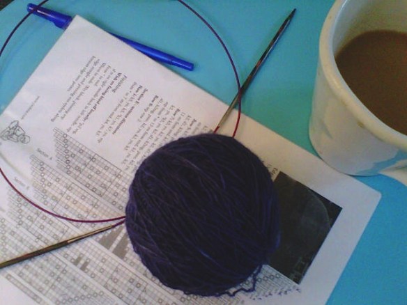 And here it is, blocking on the dining room table. I’m not really sure how this fabric will behave. I’m pretty sure I blocked my swatch, but such a small square of knitting doesn’t really offer a lot of certainty when I want to know how a whole sweater of cotton-linen yarn is going to act. I’m a bit worried that the weight of the sweater will drag down the neckline as I wear it. Have you guys ever put a cotton-linen blend in the dryer on low? If this opens up too much, I might attempt that.