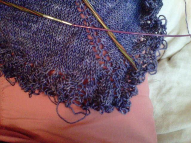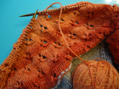 Here’s a full length shot, over a long-sleeve tee. I’m hoping that blocking will take care of that wavy bit near the bottom, and I’m hoping to get just a little more length out of it so that the finished sweater will be in between a regular sweater and a tunic.