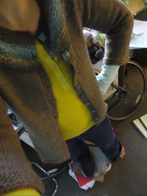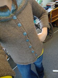 Yep, I just found the song in my iTunes library to accompany this morning’s blogging. Just picture me sitting here with my cup of coffee doing the “wooowooo” section that comes right before the big build up to “Why do you build me up, buttercup baby, just to let me down…” It seems that I typed “butter” into the iTunes search field, so now we’ve got The Band doing “Mystery Train” with Paul Butterfield. I’ll take it. Anyway, despite the obvious connection to “Build Me Up Buttercup,” bits of the song do seem relevant to my feelings about this sweater. I’ve got lots of pictures today of me in the sweater in various stages of the rest of the knitting.