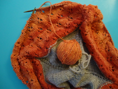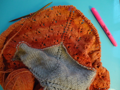 Here’s Buttercup after binding off the body. In this picture you can totally see when I put it away for several weeks — that line around my middle is not my shorts showing through; that’s a crease from where my circular needles lingered for all too long.