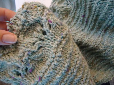 Here’s a close up of the neckline. I picked up stitches as directed, but knit a few extra rows to bring the neckline in a little bit. I love this neckline, and I think it is pretty flattering. The challenge will be what to wear underneath it because of how open some of the lacework is.