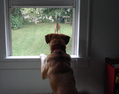 Yep, that’s Boh, staring down a young deer in the yard. I snapped this less than ten minutes ago. Given all of the activity in the yard, Boh has done an excellent job of re-entering civilization over the last week. I’m so proud.