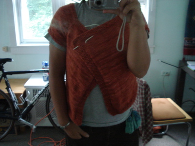 This is the beginning of sassymetrical, by gaysknits. I queued it awhile ago, but when I saw The Plucky Knitter’s version, I knew it needed to be next on the list. This pattern seems to be the perfect use for 3 skeins of Malabrigo in the cinnabar colorway. I’m excited about this, and a bit nervous because this is the first pattern I’ve modified to accommodate a yarn choice in a different weight. The pattern recipe is written for a dk weight, using size 6 needles, and thanks to gaysknits’ instructions, I’ve calculated my gauge, the number of inches I want my finished cardigan to be, and then made some guesses about proportions, particularly with respect to the sleeve stitches. Here’s what I’ve got: