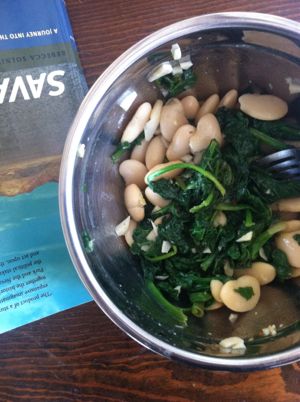 Beans, greens, and reading. (This was a super delicious, energy-boosting meal heavily modified from a recipe in one of Heidi’s Super Natural cookbooks — I swapped kale for dandelion greens, and butter beans for chickpeas.)