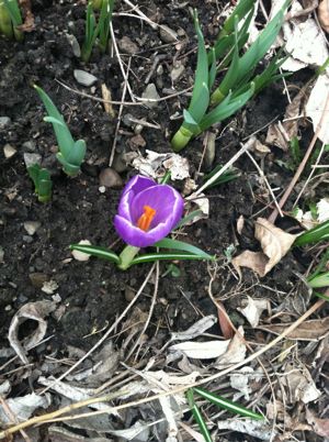 The first bloom in my yard. I moved here in May, so I’m still discovering what’s in the yard. Hooray for spring flowers! (Anybody know what this is?)