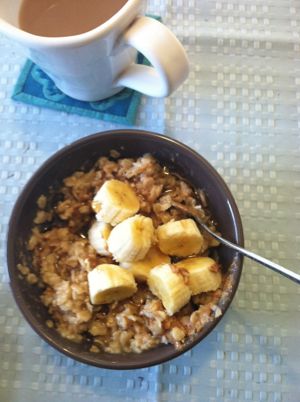 Coffee and oatmeal with bananas, peanut butter, and agave syrup. Breakfast of champions.