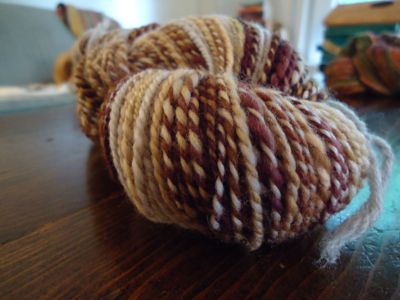 These pictures are of my finished skein and change of some SCF organic merino in cosmopolitan. I split the fiber lengthwise and was aiming for long repeats, and while there is more barberpoling than I was aiming for, I’m happy with the result. This is 230 yards (205 + mini-skein of 25) of squishy light worsted weight wonderfulness. I’m so excited to check out all the patterns you suggested for my Rhinebeck-cauldron. Any thoughts on this? It is super soft organic merino, so I’m thinking hat, cowl, or super simple fingerless mitts.