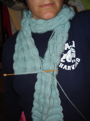 Last night I started my third skein, and I think this is going to be long and luxurious. This is a pretty substantial knit, and while I wouldn’t call the scarf heavy, I think it will stretch out considerably with wear. I absolutely adore superlong scarves, so I think this will become fast favorite. It is starting to warm up here in the afternoons, so I better hurry up and finish it so I can wear it before next fall!