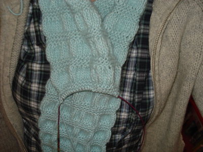 I’m making serious progress on the Gathered Scarf. While not the quickest knit, due to all the needle switching and kfb/k2tog, this is a lot of fun. It doesn’t hurt that the yarn may be the softest I’ve knit with: Blue Sky Alpacas Suri Merino, for those of you just tuning in. In this picture, the scarf is not yet wrapped around my neck.