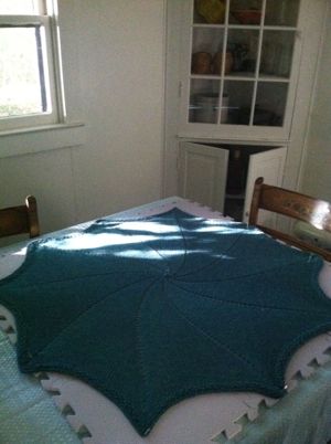 And now it is blocking on the dining room table. It feels so good to have this off the needles. I’ll post FO pictures once it is dry.