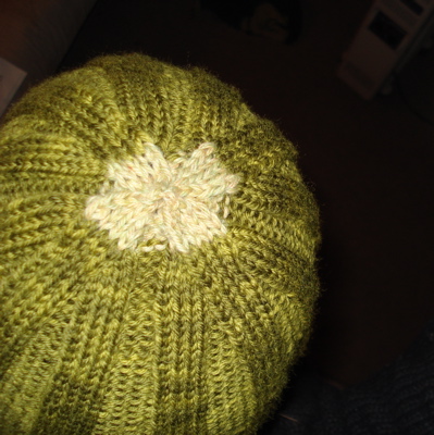 As you can see here, I did run out of wool. My photography skills leave something to be desired here; the color I used for the very top is actually a slightly lighter shade of green — something akin to a celery heather, if you will. I am satisfied with how this turned out, though after I bound off, I realized that the bulk of the hat is superwash, and that teensy circle up top is not. No matter: the boy who will be wearing this will likely never wash it…