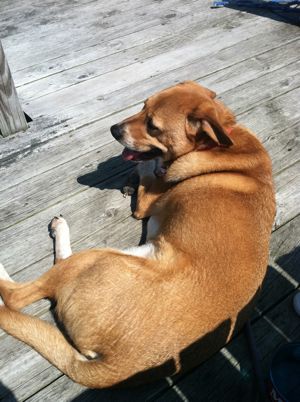 And here is Boh, happily lounging on the dock next to the picnic table. It is supposed to be HOT today, so I’m guessing we’ll find ourselves out by the lake this afternoon, though not until after we do a lot of work around the house. My parents brought a truck full of furniture yesterday — things from their basement and from my grandmother’s house (she just moved into a smaller apartment in an assisted living facility), and they’ll be here for a few days to work and play. We have plans to plant some containers full of herbs, replace the shower head, decide about a dehumidifier for the basement…things like that. I’ll have lots more lake house pictures soon!