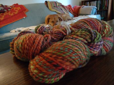 This is the second half of my Rhinebeck/Cauldron experiment, 188 yards of squishy 2-ply (in 150 and 38 yard skeins). My initial plan was to make this into another eternity scarf, and while I’m not sure if I’m going to to follow that pattern exactly, I think this yarn still wants to become a big squishy ’round the neck sort of thing. I’ve got 400 or so yards total to work with, which gives me lots of options. What would you make with this? (Boh clearly has no opinion, as evidenced by these photos.)