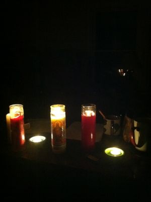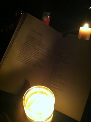 I ended up spending part of my hour reading some Mary Oliver poems. The book I’m teaching this week opens with Oliver’s “Wild Geese” as the epigraph, which I read to my students on Wednesday. It begins, “You do not have to be good. You do not have to walk on your knees/ For a hundred miles through the desert, repenting.” It was nice to read it by candlelight.