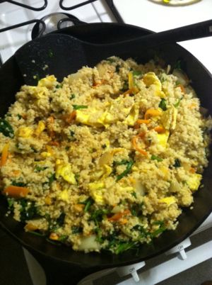 And last night, I made a big batch of Heidi’s Millet Fried Rice, from Super Natural Cooking. I’d forgotten how much I like millet — and how much I like this recipe. Basically, you cook the millet, and when that’s almost done, you make a super thin egg pancake, by melting butter with some toasted sesame oil in a large pan, beating a couple of eggs as if to make an omelette, and then pouring in the egg. You swirl the eggs around to get a really thin layer, and then fold the eggs over on themselves once they are cooked enough to let you do that. Shortly after that, you remove the egg from the pan, and then stirfry whatever veggies you’re using in a super hot pan, and then you add the millet, some soy sauce, and then you slice the egg pancake into strips and add that, too. I topped mine with onion sprouts and some canned roasted red pepper, both from my spring CSA box. I might have eaten this for lunch and dinner today, too.